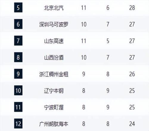 浙江、辽宁、宁波和广州占据9-12位。浙江队遭遇两连败,相较于赛季初的强势崛起,近期状态有所放缓。辽宁队同样两连败,核心问题在于得分点匮乏,即便赵继伟复出也难以盘活全队进攻。宁波队遭遇三连败,国内球员得分能力不足成为主要短板。广州队则表现稳健,本轮大胜北控,紧咬排名。
