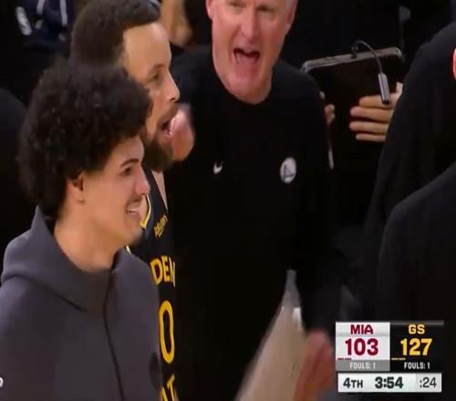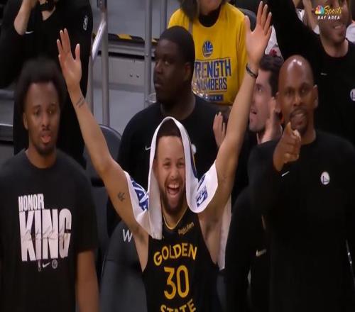库里在场下的兴奋劲儿很足,看到希尔德三分命中他双手举天+大小露齿,库里知道这场比赛拿下了,而且自己在末节只需要打3分钟等于提前打卡下班。