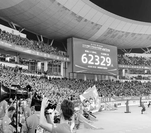 11月1日,“苏超”决赛现场的大屏幕显示共有62329名球迷到场观赛。 (视觉中国)