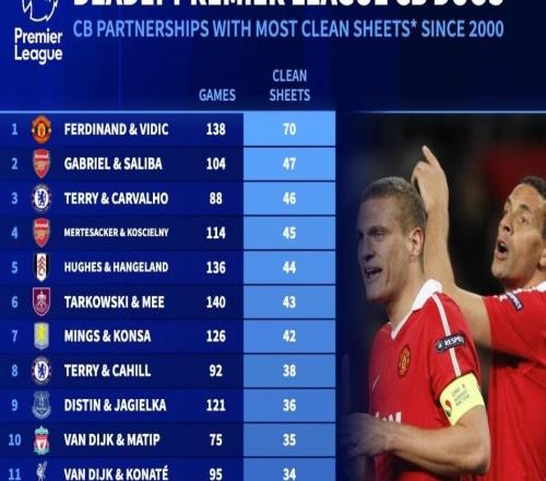 北京时间1月20日,德转列出了自2000年以来英超首发中卫搭档零封次数榜,曼联的里奥-费迪南迪和维迪奇以138场比...